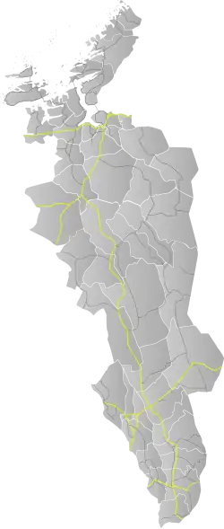 Norwegian National Road 3 (Norwegian: Riksvei 3, Rv3) is a Norwegian national road that is the main route through the Østerdalen district in Eastern Norway. It has been dubbed Den grønne Snarvei which means 'the green shortcut' by the old Hedmark County Municipality.[1][2] The route runs south from European Route E6 at Ulsberg in Rennebu Municipality in Trøndelag county, via Tynset and Elverum, to Stange in Innlandet county, where it rejoins European Route E6. The route was 291.3 kilometers (181.0 mi) long, of which 277.9 kilometers (172.7 mi) are in Innlandet county and 13.4 kilometers (8.3 mi) are in Trøndelag county.[3]