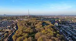 The top of the ridge is above 100 metres for a distance of well over 2 kilometres, becoming a transmission site for telecommunications in the South East.[2][20] Television poineer John Logie Baird moved his workshops to under the main transept of the Crystal Palace, with the transmitter on its south water tower. The workshops were destroyed by fire along with the Palace in 1936, but his studio survived and he continued transmissions until WWII, during which the tower was demolished to prevent the Luftwaffe using it as a landmark.[21] In 1955, the Croydon transmitting station, originally a lattice tower formation, was built at Beaulieu Heights, by South Norwood Hill. A few months later, the 219-metre Crystal Palace transmitting station was completed for the BBC on the former site of The Aquarium on Crystal Palace Parade. The Croydon transmitter was replaced by the current 152-metre tower in 1962, originally used for ITA transmissions. Both towers are now owned and operated by Arqiva.[22][23][24]