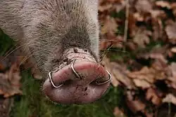 Nose rings specifically designed for pigs usually consist of open copper or steel wire rings with sharp ends, about 25 mm (1 in) in diameter. These are typically clipped to the rim of the nose instead of through the septum, as this is far more painful to the pig and is considered "thus more effective for deterring the pig from rooting than piercing through the septum is". As they may sometimes become dislodged, an adult pig may be given three to four rings.