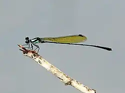 Its usual habitat is near rivers and streams. The adult is a medium-sized damselfly with a length of 35 to 40mm, and wingspan similar to its length. The thorax is black with vivid greenish-blue markings in the male, and pale brown in the female. The abdomen is dark with pale narrow bands between abdominal segments. The wings are tinted with yellow or lemon. In Australia, the distribution is in suitable habitat in the north and eastern part of the continent from the top end of the Northern Territory to central Queensland.[4] The taxon has been assessed in the IUCN Red List as being of Least Concern.