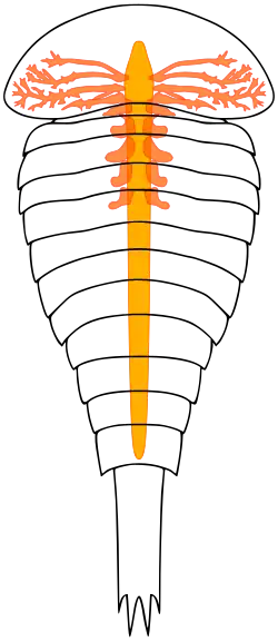 Notchia has a wide, featureless head shield with rounded genal angles and no eyes (whether the eyes are absent or just ventrally located is unclear). The trunk consists of 12 tergites with the third being widest and the body width decreasing posterior of this point. The first tergite is mostly concealed under the head shield, with the rest seemingly overlapping each other. The rest of the tergites also appear quite similar, although the lattermost are somewhat longer. The telson is rectangular, with four spines on its posterior end. Unusually, Notchia preserves digestive glands, these being represented by dark "blobs" on the fossil. Seven pairs are preserved, decreasing in length and complexity posteriorly. The two cephalic glands and the first trunk gland consist of two long branches, the first gland being thinner than the second and in turn the third. The anterior branch of each seems to further branch at its end, with the posterior being shorter and unbranched. The second to fourth trunk glands are rather similar in shape, being large and club-like. The fifth pair is only preserved via a "halo" on the fossil where the left gland would be, although this suggests it was similar to the rest.[1]