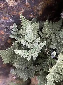 The leaves are divided into often asymmetrical leaflets which are subdivided into lobed segments, the leaf measuring 3 to 20 centimeters in total length, not counting the long, brown petiole. It is hairless and lacks scales. The leaf is covered in grainy exudate known as farina. As with many other Cheilanthoid ferns, the fronds can curl up when dry and expand again with moisture.