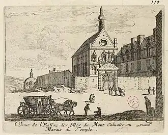 Father Joseph purchased the Hôtel de l'Ardoise, a property located at the end of Rue Vieille-du-Temple, in order to fund a second establishment for the Nuns of Our Lady of Calvary.[2] The nuns settled in the building in 1633.[2] The foundation stone of the church was laid in 1635 by Dutchess d'Aiguillon, who was standing in for her uncle Cardinal Richelieu.