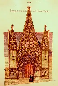 The current apse dates from the second third of the 16th century. It follows a model created in the previous century: the three sides of the apse are surmounted by acute gables. However, the Pont-Croix example is not very successful: the whole is squat and crushed, whereas the model should be vertically stretched, as in Notre-Dame de Confort, completed in 1528.[7]