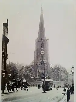 On Saturdays all 25 cars were needed in service and short workings of the Bulwell service were operated between the Market Place and Hyson Green, and to the old horsecar terminus at Church Street, Basford; the service was well patronised, overcrowding being commonplace. The receipts for the Bulwell services for the first week in August were £1,115 (equivalent to £152,899 in 2023)[2] compared with £318 (equivalent to £43,607 in 2023)[2] the previous year.[1]