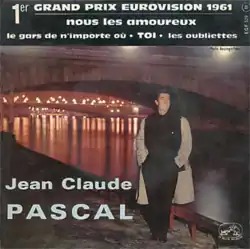 "Nous les amoureux" (French pronunciation: [nu lez‿amuʁø]; "We, the Lovers" or "Us Lovers") is a song recorded by French singer Jean-Claude Pascal with music composed by Jacques Datin and French lyrics written by Maurice Vidalin. It represented Luxembourg in the Eurovision Song Contest 1961 held in Cannes, resulting in the country's first ever win at the contest.