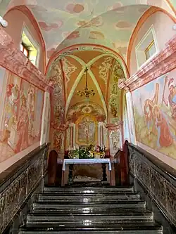 Nova Štifta is best known for its pilgrimage church dedicated to the Assumption of Mary. It is a Baroque church with an exterior arcade. It was built between 1641 and 1671[4] and was commissioned by the Jurij Khisl, lord of the castle in Ribnica, after a mysterious light appeared at Juniper Hill (Brinov vrh, 622 meters or 2,041 feet), as the site is known. The church has an octagonal nave and a smaller square chancel with beveled corners. The cupola rises 27 meters (89 ft) and is topped by a belfry with a Baroque roof. The church is probably based on the Renaissance Coronation of the Virgin Church in Lodi, Italy, which was a model for many later churches in Slovenia.[5]