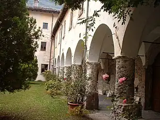 The abbey is accessed through a portal leading to a first court, with a three-span portico with groin vaults, surmounted by a loggia. There is another court around which the building revolves: at its centre are the two remaining wings of the 16th century cloister: one has five and the other has seven round arcades, supported by cylindrical columns without capitals. At the crossing between the two cloister wings is the bell tower, built in 1725-1730, which stands at 22.50 metres (73.8 ft).[9] The abbey church is dedicated to Sts. Peter and Paul. It was built in the 18th century above the pre-existing Romanesque church from the 11th century, of which some frescoes, including the Stoning of St. Stephen, remain. The current church is in Baroque style and has a nave with barrel vaults. Half of the nave is used as presbytery, and ends in a semi-circular apse. The counterfaçade houses an organ, built in 1725.