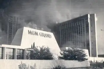 - Eighty-five guests died in a fire at the MGM Grand Hotel and Casino, and another 650 were injured. At the time, about 5,000 people were in the 26-story tall luxury hotel and casino.[57] Fire broke out in one of the hotel's restaurants on the ground floor, The Deli, at 7:07 in the morning, then spread upward through the entire building. Fire investigators determined that an electrical fire started in an attic above the restaurant and smoldered for almost three hours, "not noticed until it burst through the ceiling of the delicatessen in a ball of flame"; it then swept back and witnesses reported that "the fiery ball... rolled across the casino, melting slot machines and devouring drapes and furnishings in its path."[58] Eighteen people in the casino died, while others died of smoke inhalation and carbon monoxide poisoning as the fire spread between the 19th and 24th floors of the hotel. Most of the deaths were of people who were descending the stairs to escape the blaze.