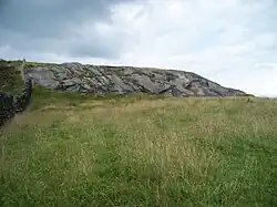 Although the prominence is not that great because of the close proximity of other hills, it is well known in the area for its distinctive, wide, but not particularly high, rocky outcrop. The summit of the hill is approximately 300 metres (980 ft) above sea level.[2]