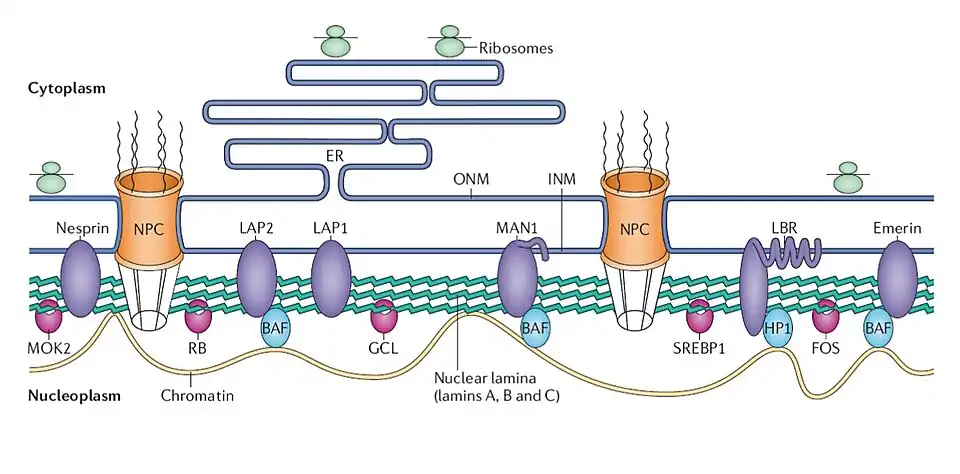 Structure and function of the nuclear lamina. The nuclear lamina lies on the inner surface of the inner nuclear membrane (INM), where it serves to maintain nuclear stability, organize chromatin and bind nuclear pore complexes (NPCs) and a steadily growing list of nuclear envelope proteins (purple) and transcription factors (pink). Nuclear envelope proteins that are bound to the lamina include nesprin, emerin, lamina-associated proteins 1 and 2 (LAP1 and LAP2), the lamin B receptor (LBR) and MAN1. Transcription factors that bind to the lamina include the retinoblastoma transcriptional regulator (RB), germ cell-less (GCL), sterol response element binding protein (SREBP1), FOS and MOK2. Barrier to autointegration factor (BAF) is a chromatin-associated protein that also binds to the nuclear lamina and several of the aforementioned nuclear envelope proteins. Heterochromatin protein 1 (HP1) binds both chromatin and the LBR. ONM, outer nuclear membrane.[2]