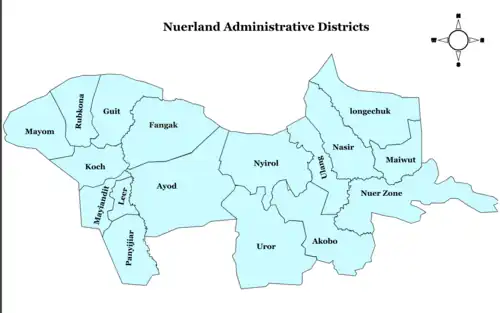 | Nasir/Kuanylualthuan | Nasir (county headquarters), Dhorading, Dinkar, Kech Kun, Gai Reang, Roam, Koat, Kierwan, Jikmir, Kuetrengke, Wanding, Mandeng, Mading, Maker, Gurnyang, Wechnyot[17][18] |
