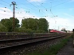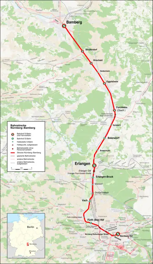 Work began in 2011 on the upgrading of the line in the urban area of Erlangen and to the north of Baiersdorf.[21][22] The Paul-Gossen-Straße S-Bahn halt in Erlangen was opened in December 2015 and one year later the Unterfarrnbach/Fürth Klinikum station followed. The upgrade between Eltersdorf and Erlangen was to be completed along with the Fürth arc, including the Stadeln and Steinach stations, by the end of 2016. At the end of 2017, the upgrade between Erlangen and Baiersdorf was to be completed by the end of 2018. This would allow the operation of services at 20-minute intervals in peak hour.[23] The upgrade of the Bamberg junction would not start before 2020 according to a presentation of DB Netz (as of mid 2014).[23] A report commissioned by the town of Bamberg questioned Deutsche Bahn upgrade plans. Freight traffic could be handled on the existing tracks in 2030.[24] The next section to Bamberg would be completed by 2024 and the completion of work in Bamberg is conceivable at the earliest in 2028 (as of 2017).[17]