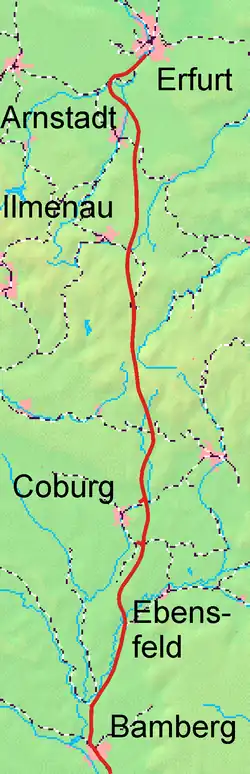 The new line begins north of Ebensfeld near the 20.4-kilometre (12.7 mi)-mark on the Bamberg–Lichtenfels line and ends in Erfurt at the entrance signals of the station.[62]