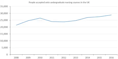 In England, Health Education England commission undergraduate and postgraduate education.[51] This is an autonomous national body which works to "ensure that healthcare staff are recruited in the right numbers with the right values and behaviours to support the delivery of excellent healthcare and drive improvement".[51] The number of commissioned places for nurses has varied year on year, as follows:
