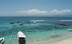 Nusa Lembongan is approximately 8 square kilometres in area with a permanent population estimated at 5,000.[4] Twelve kilometres of the Badung Strait separates Nusa Lembongan from Bali Island. The island is surrounded by coral reefs with white sand beaches and low limestone cliffs. Nusa Lembongan is separated from Nusa Ceningan by a shallow estuarine channel which is difficult to navigate at low tide. There are no permanent waterways on Nusa Lembongan. There is a suspension bridge linking Nusa Lembongan and Nusa Ceningan which takes foot and motorbike traffic only.