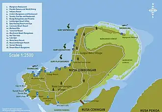 There are three main villages on the island. Jungut Batu and Mushroom Bay are the centres of the tourist-based industry and activities on the island[5] whilst much of the permanent local population resides in Lembongan Village.
