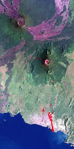 Extensive lava flows from the 2010 eruption can be seen on satellite photographs[7] reaching 25 kilometres (16 mi) south-west to Lake Kivu, about 22 kilometres (14 mi) north-west and 35 kilometres (22 mi) north-north-east.