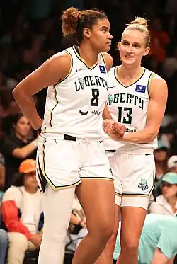 On 11 April 2022, Sabally was drafted fifth overall by the New York Liberty in the 2022 WNBA draft.[8] On 15 April 2022, Liberty general manager Jonathan Kolb announced Sabally would miss the 2022 WNBA season due to injury, after she aggravated her right knee, which has twice required surgery for a torn ACL.[9] On 28 February 2023, Sabally signed a rookie scale contract with the Liberty.[10] She missed the first half of the 2024 WNBA season recovering from a back injury before the Olympics break, where Sabally joined her Liberty teammate Leonie Fiebich on the German national basketball team.[11] During game 5 of the 2024 WNBA Finals against the Minnesota Lynx, she scored 13 points and seven rebounds in 17 minutes off the bench to help the Liberty win their first WNBA championship in franchise history.[12] During the third quarter she scored seven consecutive points for the Liberty, helping them gain their first lead of the game. During overtime she recorded a steal and a layup to extend the Liberty's lead to five points. She also recorded a defensive rebound with 13 seconds remaining in overtime to help secure the win.[13][14][15] The Liberty's star player Breanna Stewart said in the post game press conference that Sabally was "The X Factor" for contributing to the team's championship win.[16]