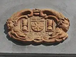 Above the main entrance is a wall stone featuring the name "R. Koch", a compass rose, a Dannebrog and two sand clocks. The sign dates from Tasmus Kock's ownership of the building in the 1760s. The framing with angel heads is, however, believed to be around one hundred years older than that. The historian Peter Lind has suggested that the relief is a former epitaph from one of Copenhagen's churches which was adapted for its new use by a stonemason.[9] Two side wings from 1784 project from the rear side of the building.