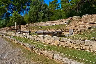 Nymphaeum (Olympia) (Latin, Ancient Greek: νυμφαῖον), etymologically "home of the nymphs" or water goddesses, at ancient Olympia was the official name of a water-distribution structure constructed in the mid-2nd century at that site to provide water to the masses who attended the Olympic Games in July and August. Nymphaeum was the general name throughout the Mediterranean for an ornate structure that terminated an aqueduct bringing water from distant elevated terrain, say a stream or copious springs.[1][note 1] This one had substructures, statues, and ornately patterned stonework; its main purpose, however, was functional. It received water from the aqueduct into a cistern and released it by stages into a system of open and closed channels leading around the site. The end partaker of the water carried a secular patera, or small drinking bowl, around with him, dipping into an open trough for the water, as is suggested by the fact that at least some of the statues carried such paterae in one hand (though they may also have been performing libations). Troughs went everywhere through the site to accommodate the crowds.