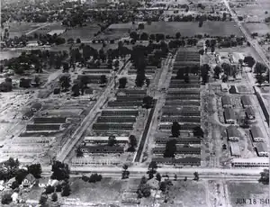 Adjacent to the 160-acre property was the Pythian Home of Missouri built by the Knights of Pythias.[3] The Army, using an order of immediate possession, bought the "castle" from the Knights of Pythias for $40,625 which was half of its assessed value.[4] The castle was renovated and converted into the Enlisted Men's Service Club.[3] The army built a ballroom, bowling alley and gymnasium inside of the building. Part of the basement of the castle was converted into a prison for Italian and German prisoners who required medical care.[4]