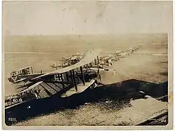 The first twenty O/100s deployed to France were received by 7 Squadron and 7A Squadron of the 5th Wing RNAS at Dunkirk in late 1916.[16] At first the O/100s were used for daylight attacks over the North Sea, damaging a German destroyer on 23 April 1917, but the loss of an aircraft to fighter attack two days later resulted in a switch to night operations, usually by single aircraft, against German-occupied Belgian ports, railway targets and airfields. On the night of 16/17 August 14 O/100s dropped 9 long tons (9.1 t) of bombs on Torhout railway station.[17] O/100s from Coudekerque carried out anti-U-boat patrols off the mouth of the River Tees in September 1917. Eleven U-boats were sighted and seven attacked with bombs, but none was sunk, although U-boat operations were drastically reduced in the area.[18]