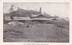 At first the OK Copper Mines Development Syndicate NL employed a dozen men mining the rich surface ore (37% copper) which was hauled to Mount Garnet for smelting. A road was completed to Mungana on 9 August 1902, and the first three teams departed that day with 211 long tons (214 t) of copper ore for Mungana railway station for transportation to the Mount Garnet smelters at a freight cost of £3/10/0 per ton.[1]