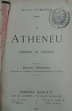 O Ateneu (English: The Athenaeum)[1] is an 1888 novel written by the Brazilian author Raul Pompeia. It is considered one of the most prominent examples of Brazilian Naturalism, Impressionism and Realism.[2] The book narrates, in the first person, the story of Sérgio, an eleven-year-old boy who is sent to a well-respected all-male boarding school—known as the Athenaeum, hence the book's title—by his father. The school has very strict rules imposed by its headmaster—Aristarco—which cause a general sense of riot amongst the students; homosexuality is common amongst most students, which is partially explained due to the presence of just one woman in the school—the nurse and wife of Aristarco, Dona Ema—and the lack of contact with the external world.