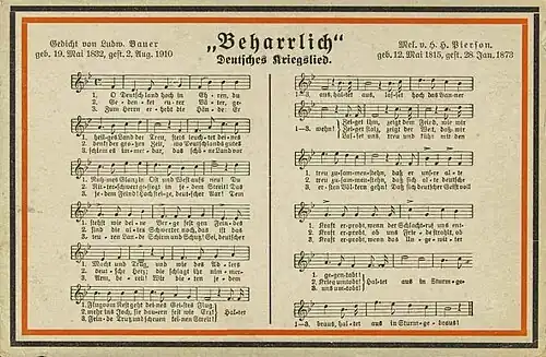 In 1858, Henry Hugh Pierson, an English composer resident in Germany, had written a tune for the patriotic song "Ye Mariners of England" by Thomas Campbell.[1] One year later, he met Ludwig Bauer, who later married Pierson's stepdaughter Dorothea Lyser. Pierson asked Bauer to write a German text to the existing tune.[2]