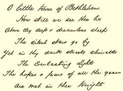 As Christmas of 1868 approached, Mr. Brooks told me that he had written a simple little carol for the Christmas Sunday-school service, and he asked me to write the tune to it. The simple music was written in great haste and under great pressure. We were to practice it on the following Sunday. Mr. Brooks came to me on Friday, and said, "Redner, have you ground out that music yet to 'O Little Town of Bethlehem'?" I replied, "No", but that he should have it by Sunday. On the Saturday night previous my brain was all confused about the tune. I thought more about my Sunday-school lesson than I did about the music. But I was roused from sleep late in the night hearing an angel-strain whispering in my ear, and seizing a piece of music paper I jotted down the treble of the tune as we now have it, and on Sunday morning before going to church I filled in the harmony. Neither Mr. Brooks nor I ever thought the carol or the music to it would live beyond that Christmas of 1868.