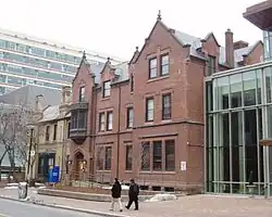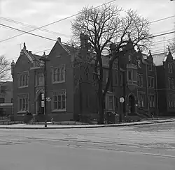 While under the ownership of the City of Toronto, a working boys' home moved from a location on Frederick Street to Oakham House, housing about 50 boys aged 14‍–‍18.[2][3] To accommodate the larger number of people, an addition to the house was added in 1900, designed by D.B. Dick, replacing the wing that Thomas' office was in.[1][4] The house was also home to a football team that played for the Boys' Union Football League.[5] The boys would be boarded in the house for free until they could find a job, at which point they would start paying a weekly sum to remain housed there.[3]