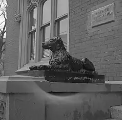 The entrance on Church Street consists of a pointed arch by multiple mouldings. This entrance is framed with engaged columns with figured capitals. A square with an ornate T is present on top of the front door and below the centre window. It has small shields on either side with heraldic devices and a coat of arms. The name of the building was carved in stone, and this sign was mounted above the front door. Two iron dogs facing each other, with iron rings in their mouths for hitching horses used to be present at the curb of the house. They were painted red in order to represent Chesapeake Bay Retrievers. Later on, the dogs were removed from the curb and mounted on the front entrance near the steps and were repainted black.[2] The dogs have since been relocated to the TMU Library's Archives and Special Collections reading room.[6]