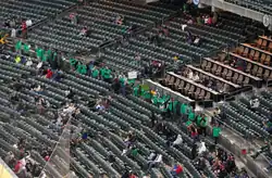 On June 13, 2023, Oakland Athletics fans organized a large "Reverse Boycott" for a random Tuesday night home game at the Oakland Coliseum against the Tampa Bay Rays. Protestors encouraged fans to attend the game to demonstrate that there is still a sizable market for Major League Baseball in Oakland.[172] Fans raised nearly $40,000 in community funding to produce and distribute protest shirts against owner John Fisher reading "SELL," and the game drew the largest home crowd of the year despite being on a weekday night. [173] Chants of "sell the team" and "stay in Oakland" were persistent throughout the game, including an eruption of those "sell the team" chants after a moment of fan-organized silence in the top the 5th inning. [174][175] Opposing pitcher Tyler Glasnow said the raucous stadium environment reminded him of the 2019 A's-Rays Wild-Card Game at the Coliseum,[176] the best-attended Wild-Card game to that point, with 54,005 people in attendance. [177]