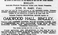 He died in 1951 at the age of 82 and in the following year his sons sold Oakwood to the Woods, a Bradford textile family. The hall now operates as a hotel.[11]