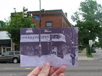 An image of the building at 26th Street South and Lyndale Avenue with a superimposed 1980s-era photo of Oar Folkjokeopus