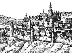 The complex is first mentioned in a document dated 2nd September 1259 in the name of Bishop Henry of Liège as burch inde der stad zen Sigin. Another document from 1261 suggests that the castle had existed since at least 1224 - at the time when Henry II, Count of Nassau and Archbishop Engelbert II of Berg divided the city of Siegen between them.[1] The castle is believed to have been built around 1200.[2] The first documented mentions give no clues as to the castle's size or structure. One from 1341 merely mentions the "vestin Sigin, Ginsberg unde der Han".[3] The first surviving precise evidence of the division of the building that had existed since 1224 and of the buildings' nature is a 1343 contract. This mentions two gates, the main touwer and an inner courtyard with a fountain, all jointly owned by the Count and Archbishop. The buildings facing the River Sieg were the archbishop's residence or "Bischofshaus", while the buildings facing the River Weiß were the count's residence or "Grafenhaus".[4][2] Over time the archbishop's influence gradually diminished. Until the late 15th century documents referred to the complex as a castle ("burch"), a fortress ("vestin") or a "castrum" - only after that date was it commonly referred to as a "Schloss" or palace.[1] From 1670 onwards the complex was known as the Altes Schloss (Old Palace) or Oberes Schloss (Upper Palace).[2]