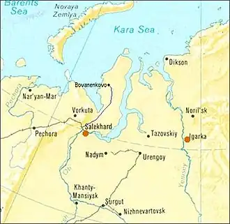 The Obskaya–Bovanenkovo Line is a 572-kilometre long (355 mi) railway line in northern Russia, built and owned and operated by Gazprom.[2] It was opened for traffic in 2010 and was built for the gas fields around Bovanenkovo on the Yamal Peninsula, the Yamal project. In February 2011, it was extended to the Karskaya station, making it 572 km long.[1] Like most railways in the former Russian Empire, it is built to Russian gauge.