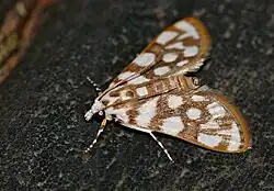 Obtusipalpis pardalis, the snow leopard, is a moth in the family Crambidae. It was described by George Hampson in 1896.[1] It is found in the Democratic Republic of the Congo (Katanga), Ethiopia, Mozambique and Zimbabwe.[2]