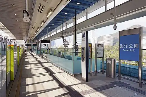 Ocean Park (Chinese: 海洋公園; Cantonese Yale: Hóiyèung Gūngyún) is an MTR rapid transit station in Hong Kong on the eastern section of the South Island line, which serves Ocean Park Hong Kong and Wong Chuk Hang. The station opened on 28 December 2016[1] with the rest of the South Island line.