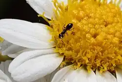 Foraging workers often visit Pisonia flowers and will feed on the nectar.[29] Other flowers they will visit include Canavalia, Commicarpus, Ipomoea, Melanthera, Plumbago and Scaevola.[26] Ochetellus flavipes regularly attends the mealybug Prorsococcus acanthodus and protects it by building shelters.[23] They also attend a number of butterfly larvae, including Anthene lycaenoides (Pale Ciliate Blue),[30] Ogyris amaryllis (Satin Azure),[31] Ogyris olane (Olane Azure) and Ogyris oroetes (Silky Azure).[32]