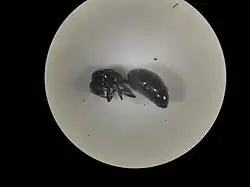 During the nuptial flight, a queen may mate with multiple males, while the males will only mate with a single queen, making them monogynous.[19] However, Ochetellus glaber queens will only mate with a single male, making them polygynous.[20] Sometimes, colonies proliferate by "budding" (also called "satelliting" or "fractionating"), where a subset of the colony including queens, workers and brood (eggs, larvae and pupae) leave the main colony for an alternative nest site.[20]
