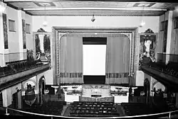 Interior of the auditorium facing the stalls, showcasing its blackwood mezzanine, Wunderlich ceiling and wall murals
