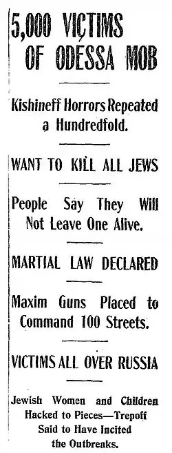 - ^ Levy, Richard S. (2005). "Odessa Pogroms". Antisemitism: a historical encyclopedia of prejudice and persecution. Santa Barbara (Calif.): ABC-Clio. ISBN 978-1-85109-439-4.