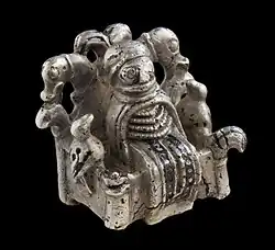 The cast silver figurine is from approximately 900 C.E. It measures 18 mm in height and weighs 9 grams.[2] It depicts an individual on a throne, wearing a floor-length dress, an apron, four bead necklaces, a neck ring, a cloak and a rim-less hat. Two birds are seated on the armrests and the back of the throne features the heads of two animals. The figurine has inlay of black niello (black coloured alloy) and some gilding.[1][3]