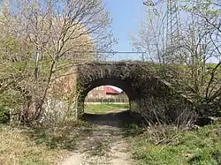 Between 1901 and 1903 in Odolany were built Russian gauge (1520 mm) railway tracks of the Warsaw–Kalisz Railway, which connected Warszawa Kaliska railway station in Warsaw with Kalisz railway station in Kalisz. The section of railway tracks in Odolany was located between the Warszawa Kaliska and Błonie railway stations.[11][19] The section included the railway viaduct, located near current Armatnia Street, which, built in 1902, was probably the first railway object in the Russian Empire to use reinforced concrete in its construction. In 1914, the railroad was rebuilt into standard-gauge (1,435 mm) railway tracks, though it consisted mostly of the provisional structures. After 1918, the railroad was rebuilt as permanent structure. The railway viaduct was not rebuilt with the standard-gauge and was disconected from the railway network. Today, it is the only remaining element of the original Warsaw–Kalisz Railway line in Odolany.[20]