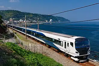 The Super View Odoriko (Japanese: スーパービュー踊り子) was the first deluxe version of the Odoriko operated from 28 April 1990 to 13 March 2020.[8][7] It used 251 series 10-car EMUs and ran between Tokyo or Ikebukuro and Izukyū-Shimoda.[3] The service was originally scheduled to commence from the start of the revised timetable on 10 March 1990, but rolling stock delivery delays meant that services were substituted by regular Odoriko services using 185 series EMUs.[8]