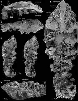 Oelandocaris has a large head shield making up roughly one half of its body length. This head shield is slightly arched, flattening towards the sides (with a slight rise above the mandibles), with a long rostrum at the tip. The back of the shield is straight, but not especially distinct from the first trunk segment. The top of the shield is smooth, with it covering all head segments. Below it, a probable median eye is preserved as a pair of blisters, with a slightly bulged organ leading to the hypostome. This hypostome is rectangular and around half the length of the shield, with the mouth located below its posterior margin and likely overhung by it. This mouth also seems to preserve a membranous “lip”, although this is only seen in the earliest stages. No sternite is preserved on the first segment, although this sternal area may be slightly more sclerotised, with the sternites narrowing towards the posterior which suggests the stomach was likely within the head.[4] Spines protrude from the back corners of the head shield, varying in length from small projections to being very conspicuous.[2] The body is composed of six tergites, the first five with a biramous limb pair and the sixth, posteriormost segment being cylindrical and lacking limbs. These tergites also have spines on the sides of the backwards margin, pointing towards the tail, slowly decreasing in size posteriorly. The tergites are U-shaped in cross-section, with slight overlap between anterior and posterior margins and spines near the back of each. The tail segment is conical and elongated, likely being a telson due to an anal opening being found near its tip. This segment also has a flattened ventral side, with an indentation near the anterior. Oelandocaris is known from seven specimens, all from the Orsten lägerstatte. The original specimen only preserved the body, however more complete specimens including limbs have been found, alongside several being of earlier life stages, with one even being from a stage where the rostrum had not developed yet.[2]