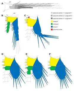 In front of the median eye, small antennulae are preserved, with larger antennae at the sides of the labrum. The mandibles and maxillae point towards the mouth, and the body limbs narrow towards the posterior along with the segments, meaning their coxae become closer together as well. The antennulae are extremely specialised, being relatively short (only three segments), but each segment bearing an extremely long outgrowth from its outwards side itself composed of several segments, with these outgrowths likely being at least half the body length. The segments of the outgrowths bear several setae, with these likely pointing outwards based on the insertion sites. Meanwhile, the limb’s segments also bear setae on their outwards edges. The second limb pair, and all others afterwards, are biramous. This second pair has a two-rowed array of eight spines/setae in each row on the basipod (inner limb portion)’s inner surface, with the forward row’s first spine having a forked tip and reaching under the hypostome. The endopod is quite short with five segments, meanwhile the exopod is larger (around twice the basipod’s size) and flattened, with each segment bearing one to two setae along their sides. The third limb pair has a somewhat longer basipod with only four setae pairs (also in two rows) and lacks the longer forked spine. The endopod of this appendage is unknown, whereas the exopod is somewhat narrower and longer than that of the second pair, with only four segments (the first being the only broadened one), and the fourth being quite small and narrow. The fourth and fifth pairs are similar, with slightly shorter basipods than the second and only bearing a cluster of setae on them. The endopods are only known from the first two segments (with the second being badly preserved), with the exopods being paddle-shaped and composed of two portions with a hinge in the middle. The first portion is triangular in shape and bears one seta on its back corner, whereas the second has multiple long setae along its margin. Alongside this, tiny spines referred to as denticles are also recorded on the outwards edge of the fourth and fifth head appendages, alongside the trunk appendages, which are similar to the former except with smaller basipods and being positioned closer together going down the body. Small pores on the tergites and limb exopods have been interpreted as sockets for sensilla.[2]