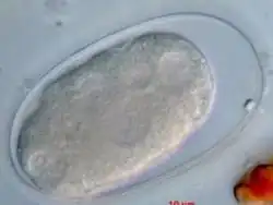 Eggs are ovular in shape and range from 50 to 100 micrometres in size; they closely resemble those of hookworms, which renders diagnosis via stool analysis useless in areas co-infected with both Oesophagostomum and hookworm.[9]